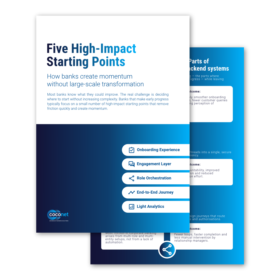 Improving digital customer engagement doesn’t require a large-scale transformation programme. This short guide outlines five high-impact starting points banks commonly choose to remove friction, create momentum and deliver visible improvements early — without increasing complexity.